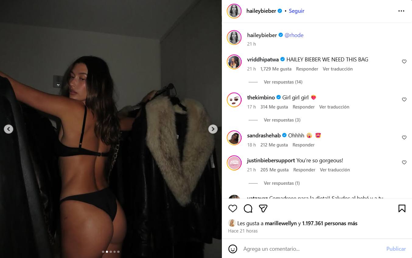 En una foto, Hailey Bieber expuso su trasero mientras usaba un par de ropa interior atrevida. Combinó la parte inferior con un sujetador a juego mientras posaba en un vestidor junto a abrigos con adornos de piel.