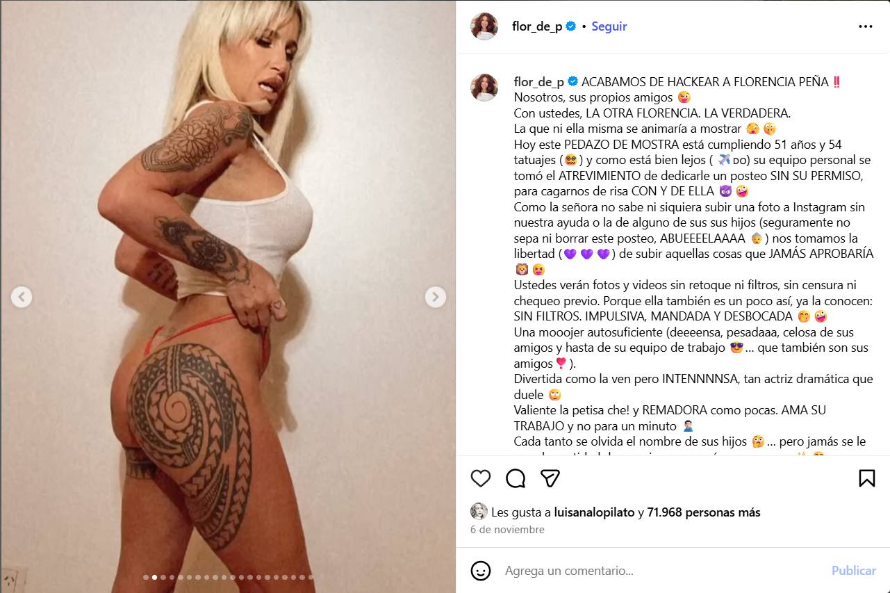 "Con ustedes, la otra Florencia. La verdadera. La que ni ella misma se animaría a mostrar. Hoy este pedazo de mostra cumple 51 años y lleva 54 tatuajes. Como está bien lejos, su equipo personal se tomó el atrevimiento de dedicarle un posteo sin su permiso, solo para reírnos con y de ella".