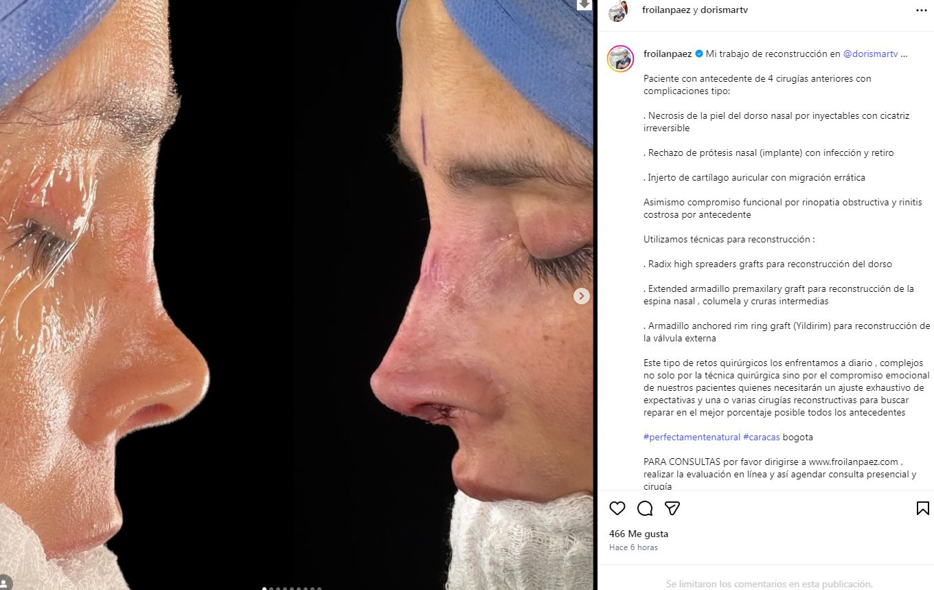 En la publicación compartida por el cirujano, titulada "Mi trabajo de reconstrucción en Dorismar", se muestran imágenes comparativas del antes y el después inmediato de la cirugía. En ellas se aprecia una nariz inflamada, con marcas propias del postoperatorio, pero con una estructura más definida y alineada, resultado de un procedimiento altamente especializado.