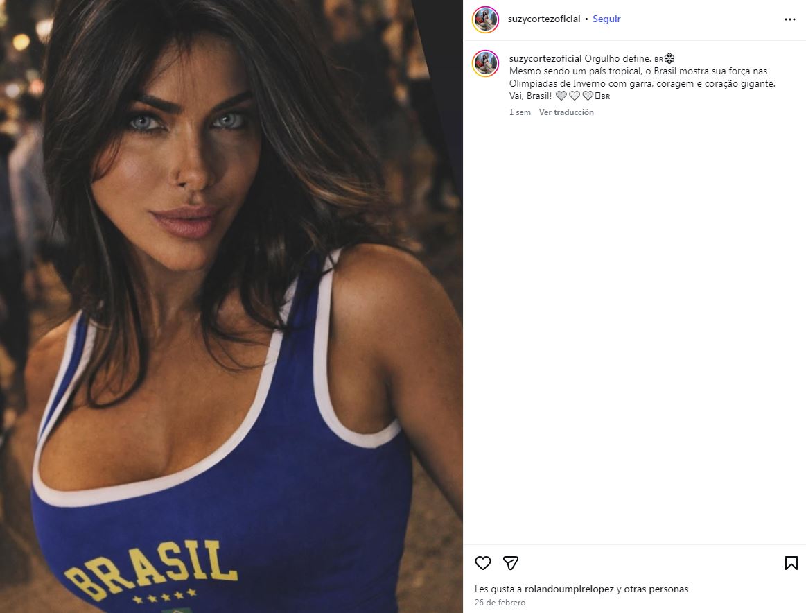En la imagen compartida por la modelo, Cortez aparece luciendo un ajustado top azul con la palabra "Brasil", acompañado de una pose que resalta su figura y una mirada directa a la cámara. La publicación estuvo acompañada de un mensaje en portugués en el que expresa su orgullo por representar a su país.