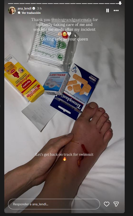 Ana Lendl compartió que sufrió un pequeño percance durante las actividades que se realizan en el Miss Grand International 2025. La modelo compartió en sus historias de Instagram una imagen donde se observa una herida en su pie derecho, junto con varios artículos médicos como gasas, desinfectante y curitas.