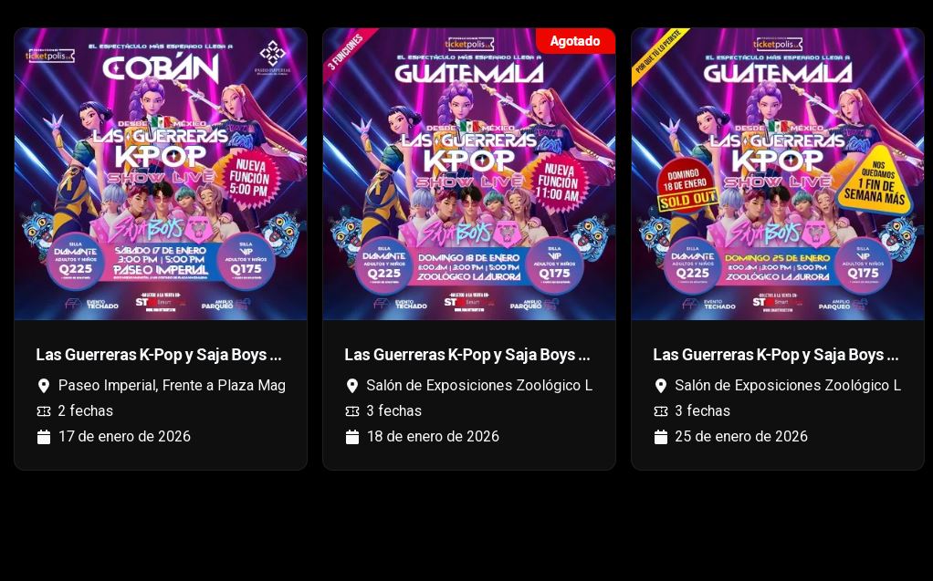 La fiebre del K-Pop continúa conquistando al público guatemalteco: tras agotar las funciones programadas para el 18 de enero, Las Guerreras K-Pop, acompañadas por la boyband Saja Boys, anunciaron un nuevo fin de semana de shows para el domingo 25 de enero de 2026, con funciones a las 11:00 a.m., 3:00 p.m. y 5:00 p.m.