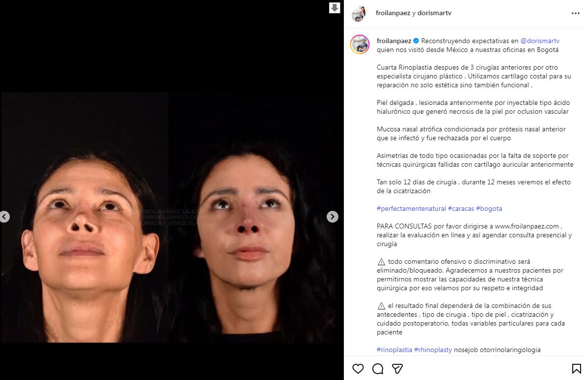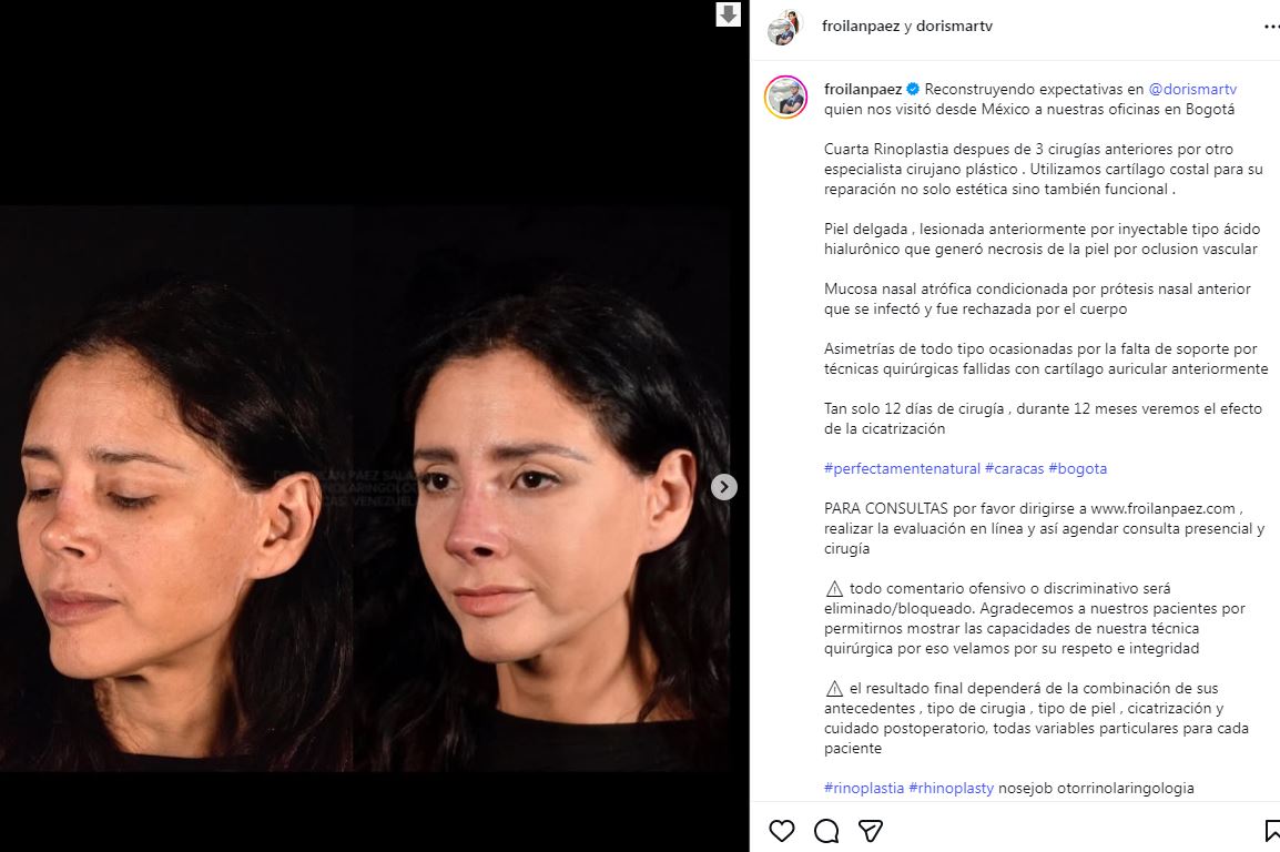 A mediados de diciembre, Dorismar reveló que se sometió a una rinoplastia que terminó en una grave afectación a su salud.