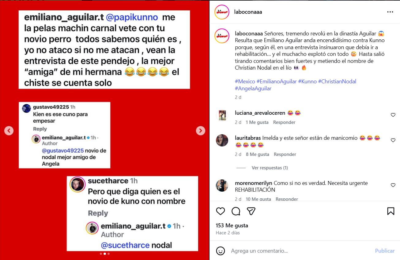 La respuesta no tardó en llegar. Emiliano arremetió con fuerza desde sus historias de Instagram, insultó al tiktoker y lanzó una revelación inesperada: sugirió la existencia de un vínculo sentimental entre Christian Nodal y Kunno.