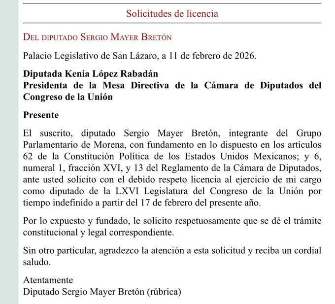 Según el boletín 3246 de la Cámara, el pleno aprobó su solicitud mediante votación económica: "El Pleno aprobó la licencia por tiempo indefinido solicitada por el diputado Sergio Mayer Bretón (Morena-Cuarta Circunscripción), a partir de este martes 17 de febrero".