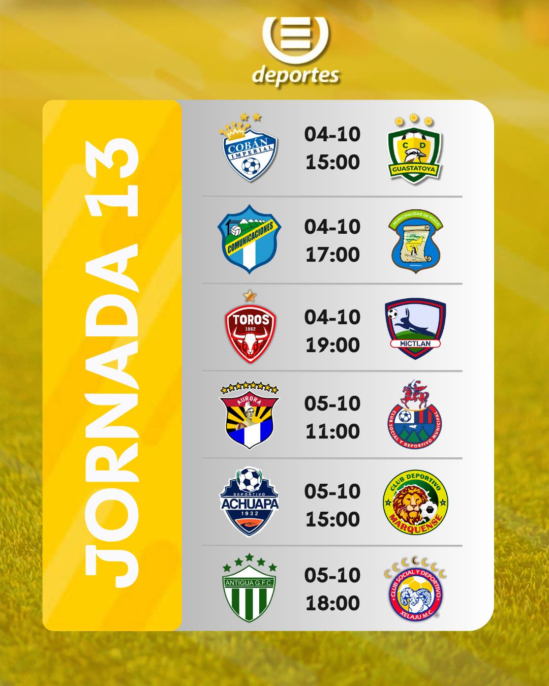 Sin seleccionados nacionales, la fecha 13 comenzará con tres partidos: Cobán Imperial-Guastatoya (15:00 horas), Comunicaciones-Mixco (17:00 horas) y Malacateco-Mictlán (19:00 horas).