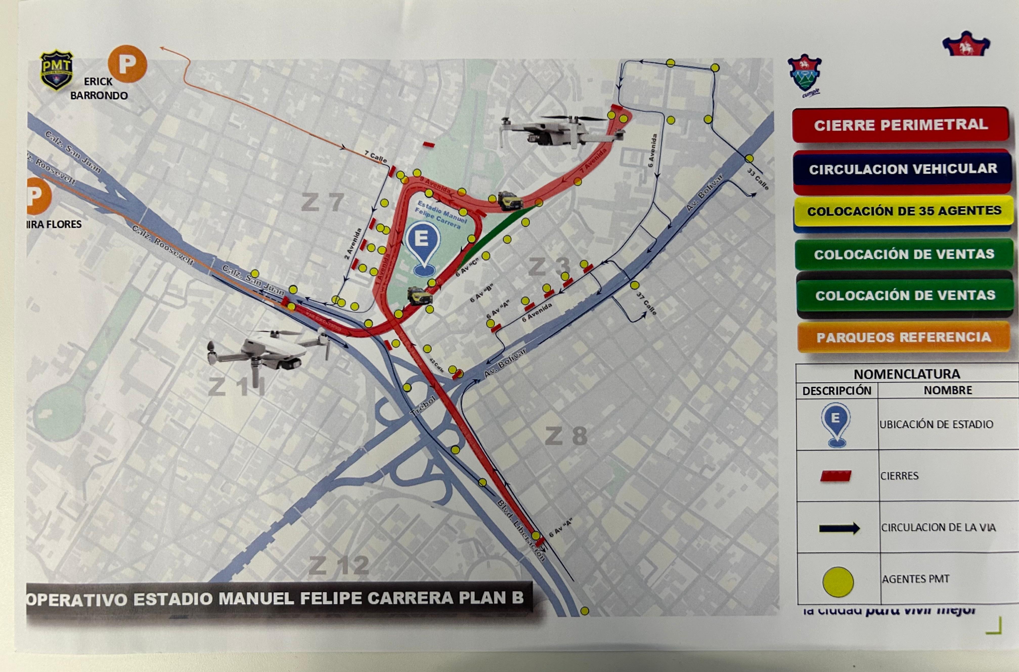 La Entidad Metropolitana Reguladora de Transporte y Tránsito (Emetra) informó en conferencia de prensa que desde las 10:00 horas se realizarán cierres de vías en los alrededores del estadio, por lo que se recomienda a los conductores tomar rutas alternas. En el operativo participarán 125 agentes de tránsito, quienes estarán distribuidos estratégicamente para orientar a los automovilistas y peatones. Además, se contará con un centro de control que brindará apoyo en todo momento y con vuelos de dron cada hora y media, los cuales permitirán monitorear el comportamiento del tráfico en tiempo real.