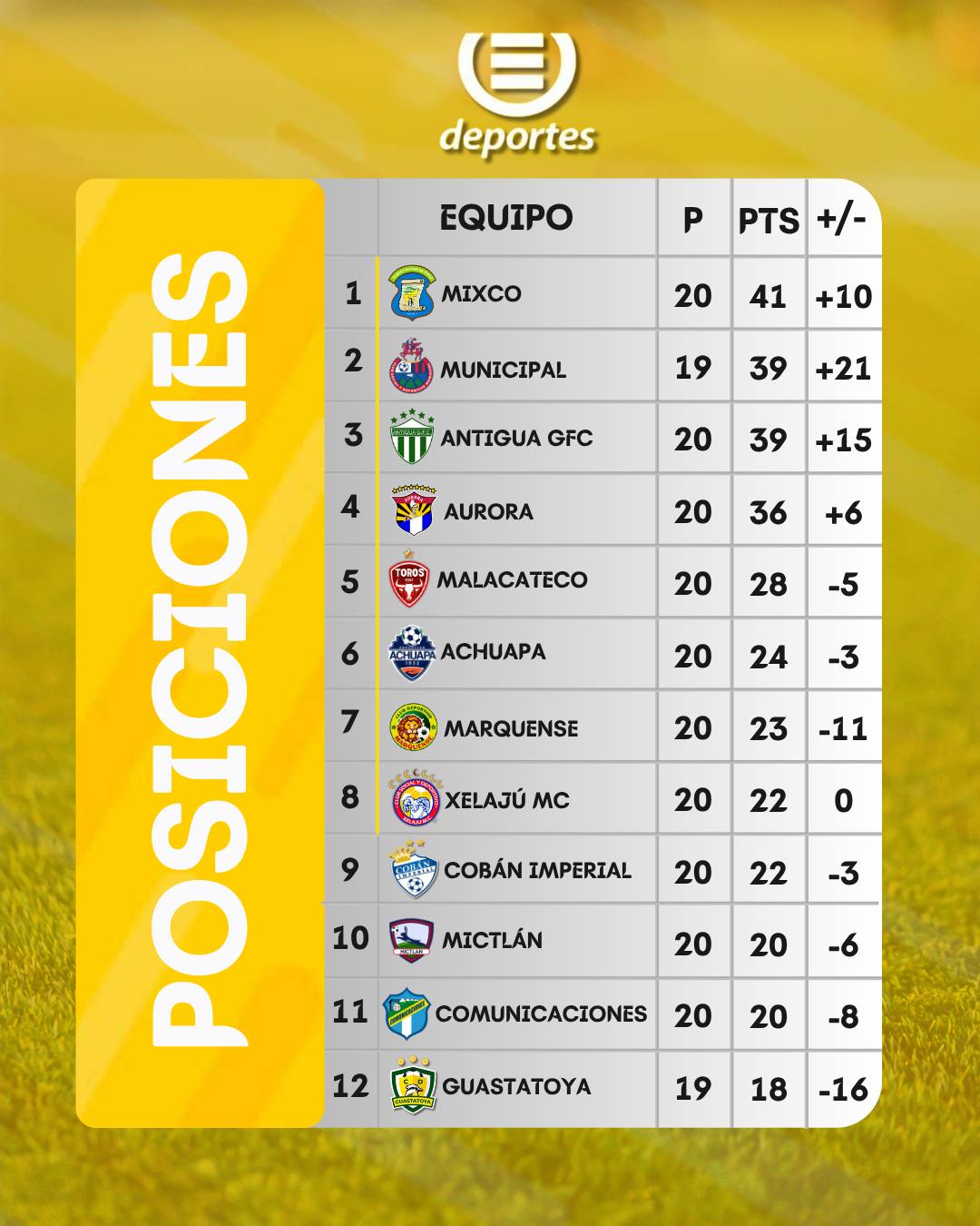 En la tabla de posiciones, Antigua logró llegar a los 39 puntos que tiene el Municipal y ocupa la tercera casilla, aunque los "Rojos" tienen pendiente el duelo ante Guastatoya. Deportivo Mixco es líder en solitario con 41 puntos.