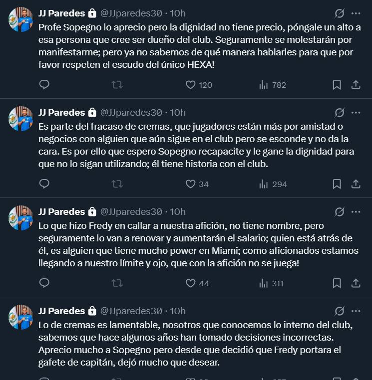 "Lo de cremas es lamentable. Nosotros que conocemos lo interno del club sabemos que desde hace años se han tomado decisiones incorrectas. Aprecio mucho a Sopegno, pero desde que decidió que Fredy Pérez portara el gafete de capitán, dejó mucho que desear", expresó el exguardameta, abriendo un mensaje cargado de molestia y preocupación por la situación actual del club. Además, recordó el episodio en el que Pérez mandó a callar a la afición. Para Paredes, aquel gesto marcó un antes y un después: "Lo que hizo Fredy al callar a nuestra afición no tiene nombre, pero seguramente lo van a renovar y hasta le aumentarán el salario. Quien está detrás de él tiene mucho poder en Miami. Como aficionados, estamos llegando a nuestro límite, y ojo: con la afición no se juega".