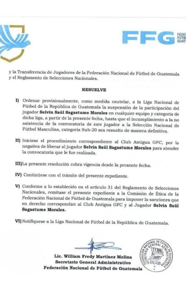 Además de la sanción provisional al jugador, la Federación inició un procedimiento disciplinario contra Antigua GFC por negarse a liberar al futbolista para atender la convocatoria. El caso también fue remitido a la Comisión de Ética, la cual deberá determinar las sanciones correspondientes tanto para el club como para el propio Sagastume, conforme a lo establecido en el Reglamento de Selecciones Nacionales.