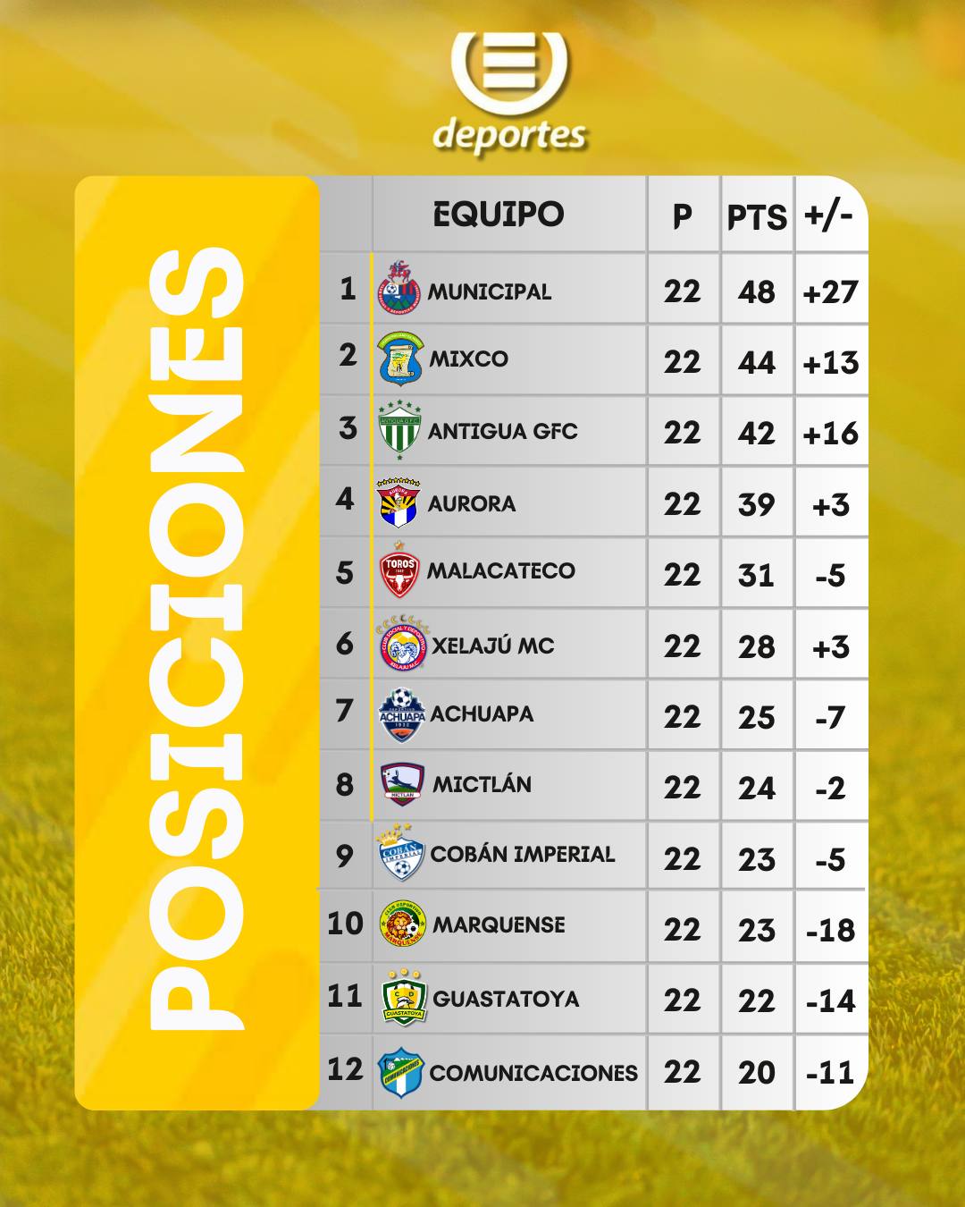 Será una lucha muy fuerte entre estos cuatro equipos: Comunicaciones, Guastatoya, Marquense y Cobán Imperial, pero clubes como Mictlán (24 puntos) y Achuapa (25 unidades) deben estar atentos para no involucrarse desde un principio en la danza del descenso.