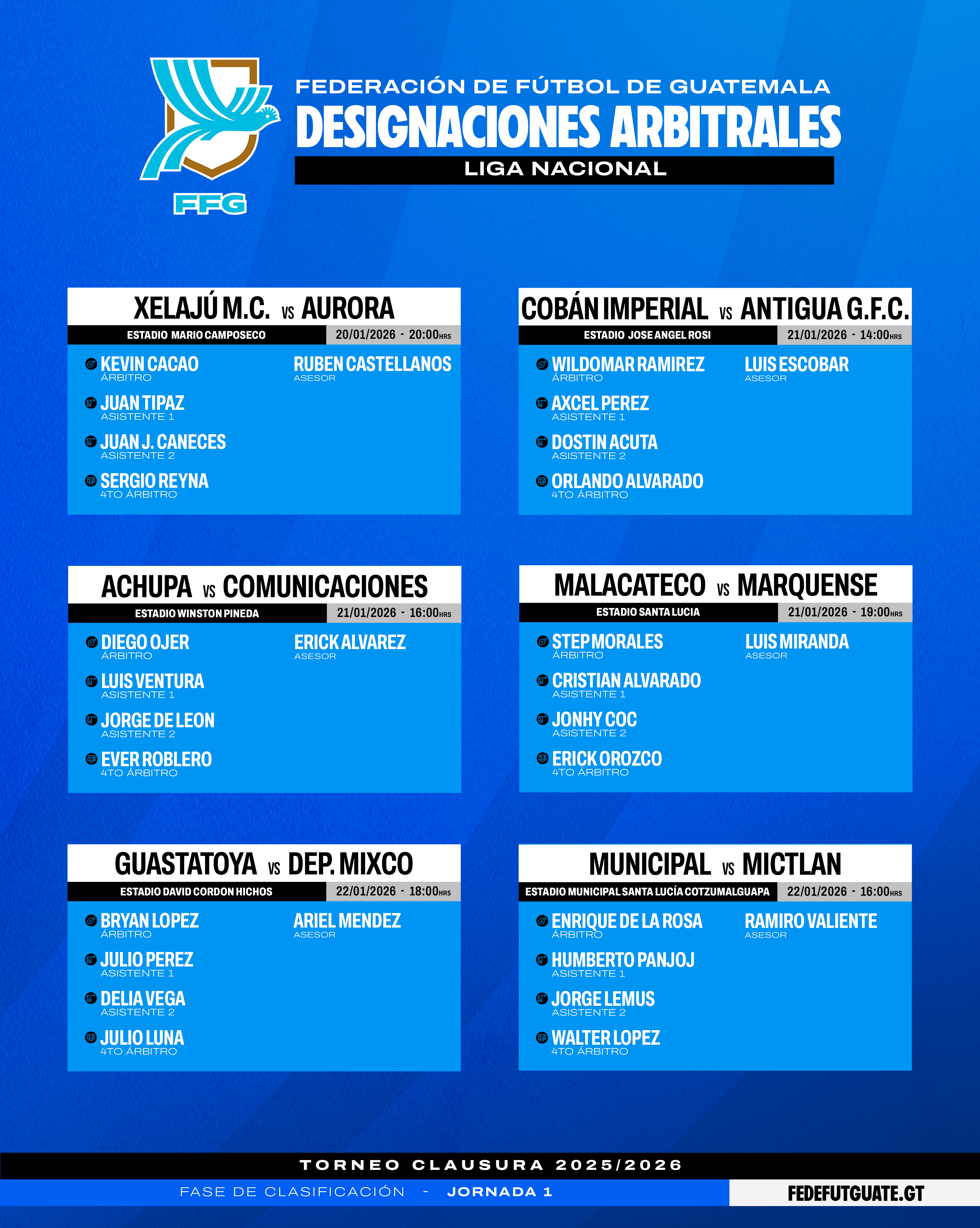 - Achuapa-Comunicaciones: Diego Ojer. Partido a las 16:00 horas del miércoles 21 de enero en el estadio Winston Pineda Gudiel de Jutiapa