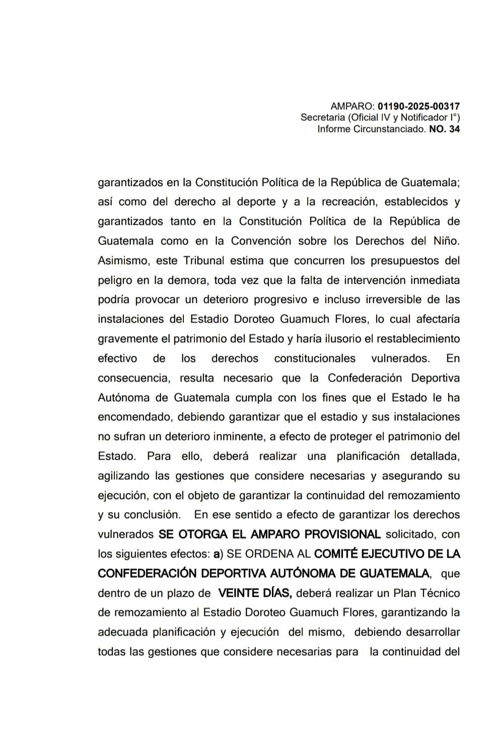 La Sala Sexta del Tribunal de lo Contencioso Administrativo otorgó un amparo provisional y ordenó al Comité Ejecutivo de la Confederación Deportiva Autónoma de Guatemala (CDAG) la elaboración y ejecución de un plan técnico de remozamiento del estadio Doroteo Guamuch Flores, al considerar que existe un riesgo real de deterioro progresivo del inmueble y una posible afectación al patrimonio del Estado.