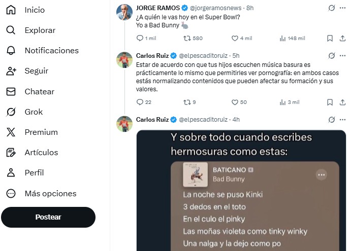 El periodista mexicoestadounidense Jorge Ramos, reconocido por haber sido el presentador de Noticiero Univision, hizo una publicación en la red social X a favor de Bad Bunny: "¿A quién le vas hoy en el Super Bowl? Yo a Bad Bunny ?".