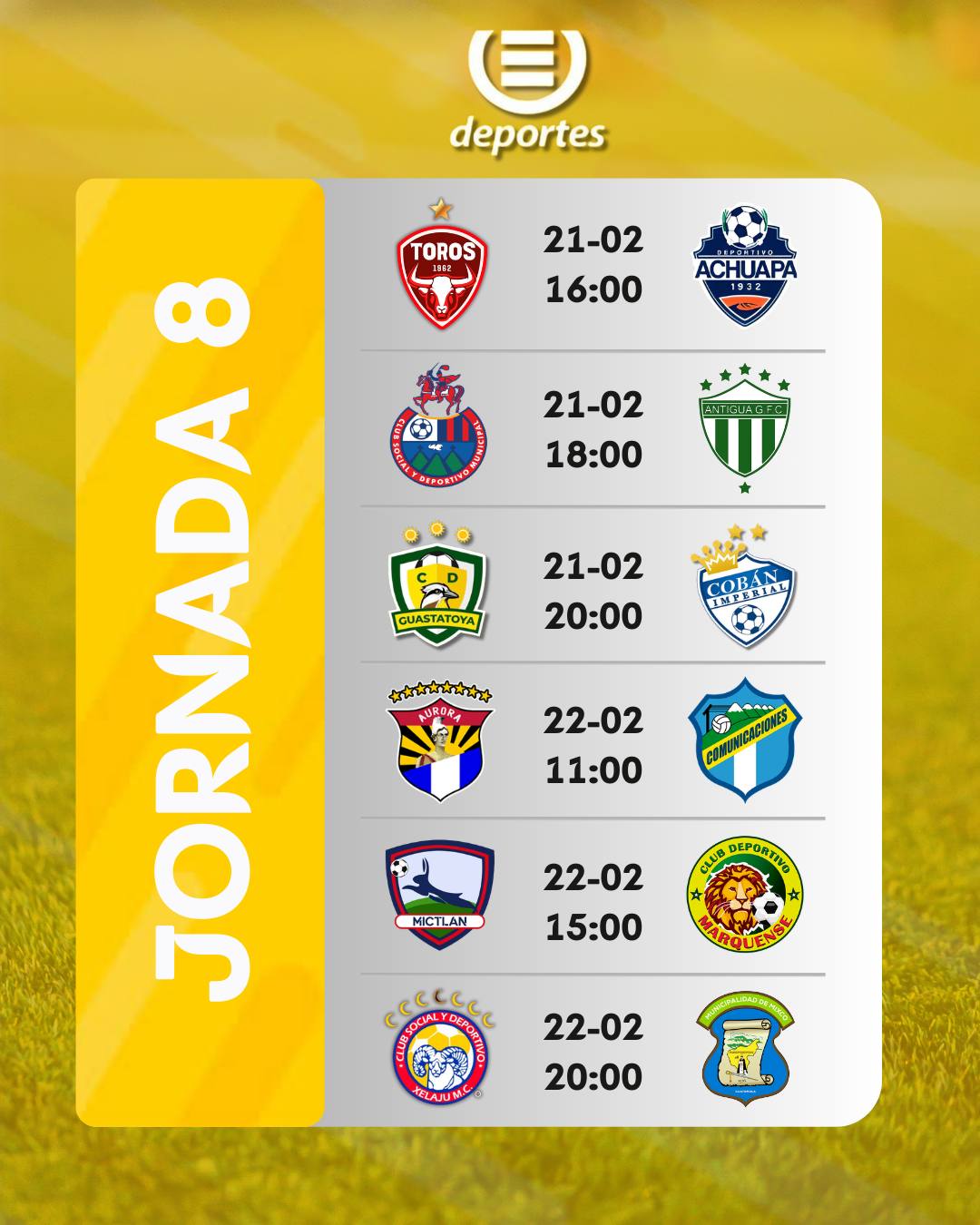 La fecha contempla seis partidos, tres a disputarse el sábado 21 de febrero y otros tres el domingo 22. Malacateco vs. Achuapa a las 16:00 horas, Municipal vs. Antigua a las 18:00 horas y Guastatoya vs. Cobán Imperial a las 20:00 horas son los duelos sabatinos.