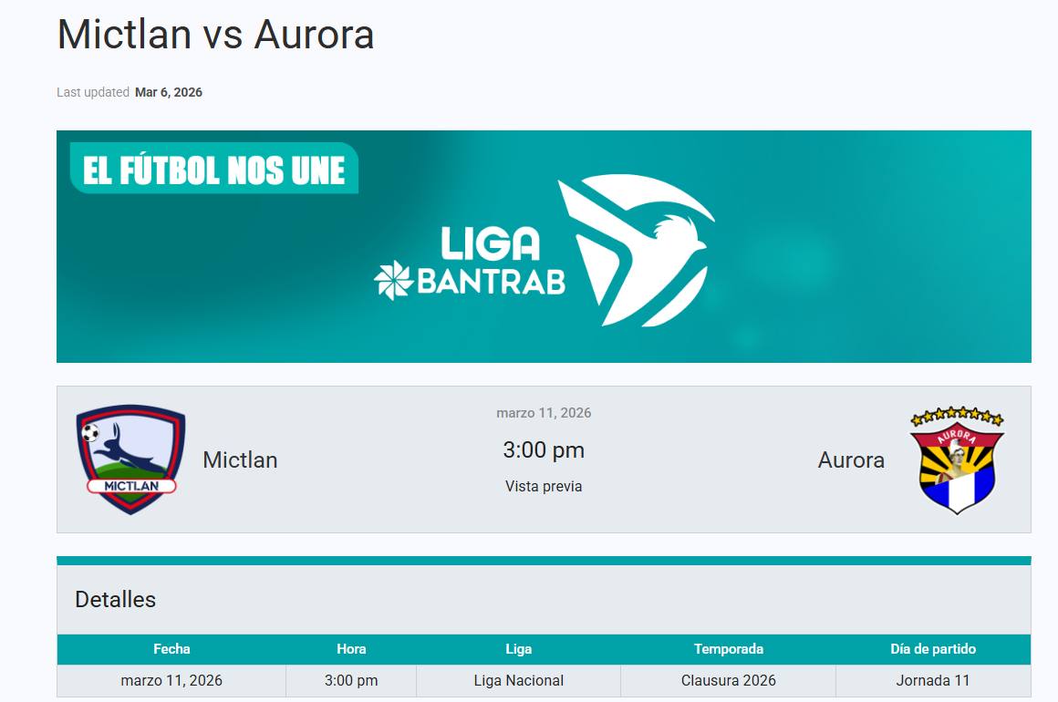 La jornada 11 del Torneo Clausura 2026 del fútbol guatemalteco no pudo completarse según lo previsto. El último encuentro programado de la fecha, entre Mictlán y Aurora, tuvo que ser suspendido debido a las malas condiciones del terreno de juego en el Estadio Asunción. Las intensas lluvias que cayeron sobre el recinto deportivo afectaron considerablemente la cancha, lo que obligó a las autoridades a posponer el compromiso por motivos de seguridad y de juego.