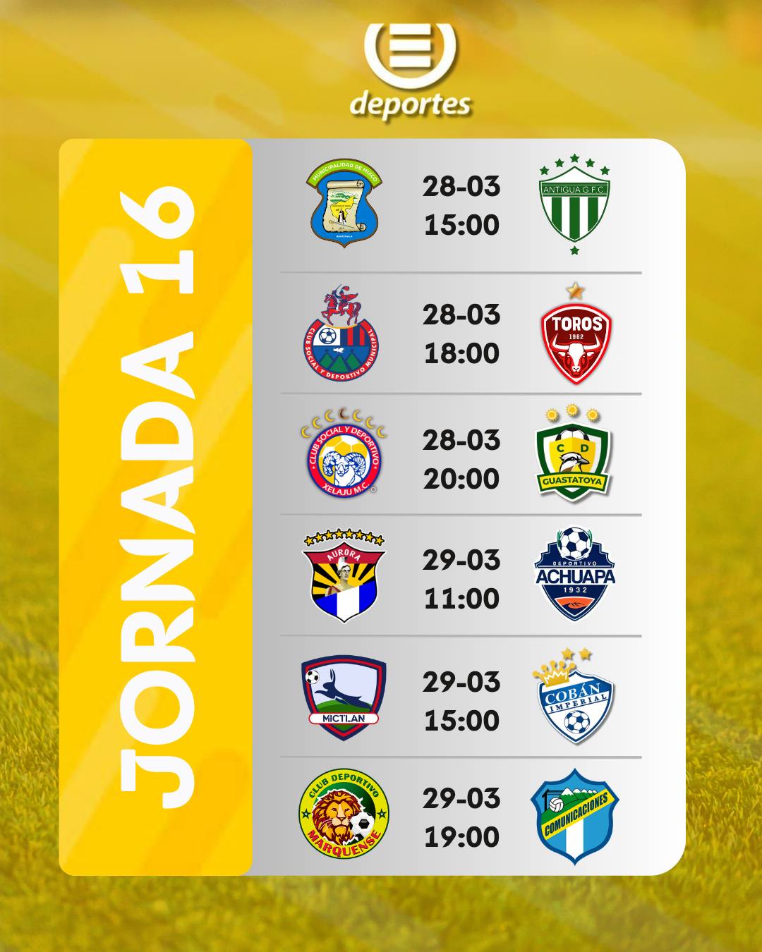 Sin la presencia de seleccionados, quienes estarían en ese momento viajando de Italia a Guatemala, la décimo sexta fecha del Clausura 2026 arrancará este sábado 28 de marzo con tres compromisos: Mixco vs. Antigua (15:00 horas), Municipal vs. Malacateco (18:00 horas) y Xelajú vs. Guastatoya (20:00 horas). Al día siguiente, el domingo 29, los tres juegos son: Aurora vs. Achuapa (11:00 horas), Mictlán vs. Cobán Imperial (15:00 horas) y Marquense vs. Comunicaciones (19:00 horas).