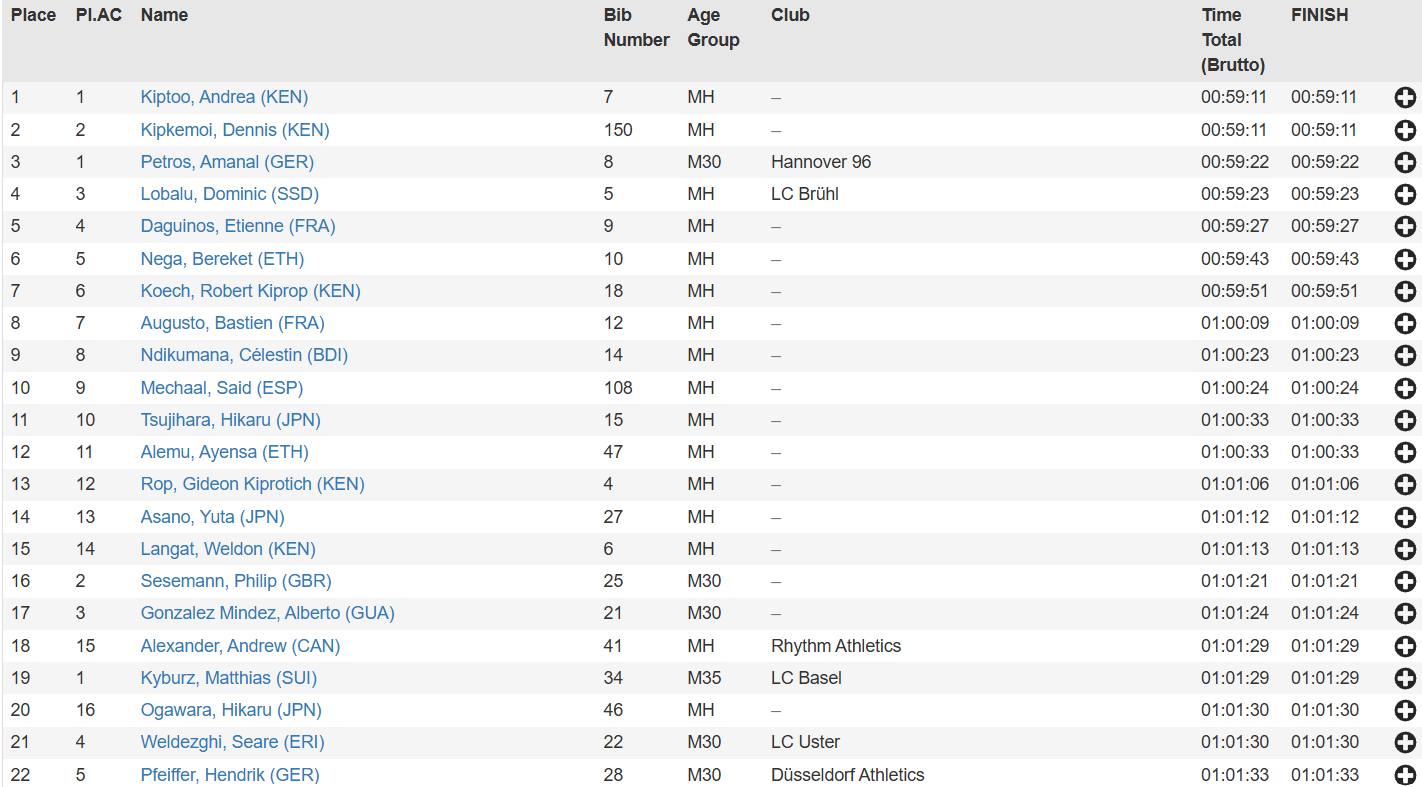 La prueba, celebrada en la capital alemana, tuvo como vencedor al keniata Andrea Kiptoo, quien cruzó la meta con un registro de 59:11. Compartió el mismo tiempo con su compatriota Denis Kipkemoi, quien desempeñó el rol de liebre y no disputó el esprint final. El podio lo completó el alemán de origen eritreo Amanal Petros, quien llegó once segundos después con un tiempo de 59:22.