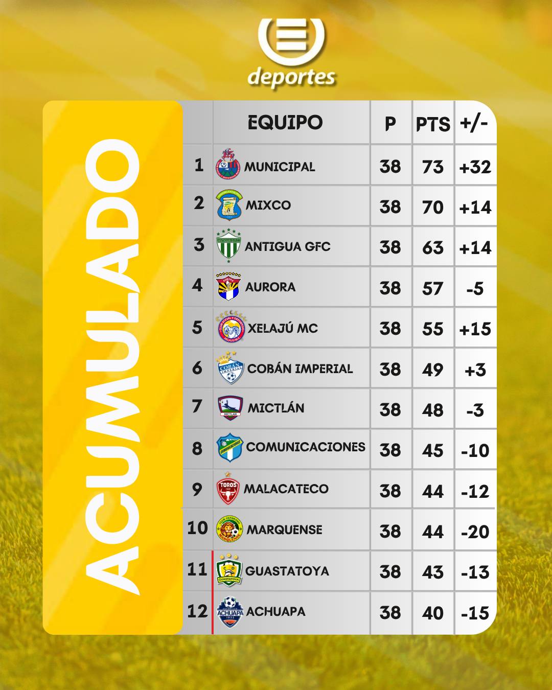 Guastatoya con 43 puntos, y siendo la última casilla que castiga con el descenso, tiene muy de cerca a Marquense y Malacateco con un punto de diferencia y a Comunicaciones con 2 puntos.