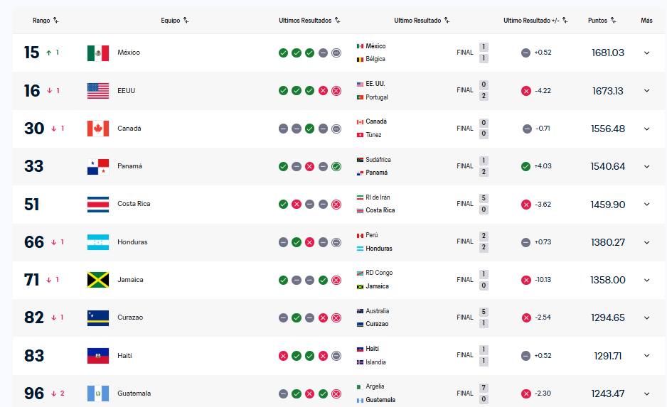 A nivel de Concacaf, la situación quedó así: Guatemala pasó de la posición 8 a la 10, y es superada por los seleccionados de Haití, Curazao, Jamaica, Honduras, Costa Rica, Panamá, Canadá, Estados Unidos hasta llegar a México, la número 1 de la región.
