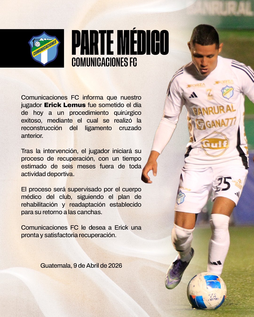 Asimismo, Comunicaciones señala que el proceso de recuperación de su futbolista Erick Lemus "será supervisado por el cuerpo médico del club, siguiendo el plan de recuperación y readaptación establecido para su retorno a las canchas".