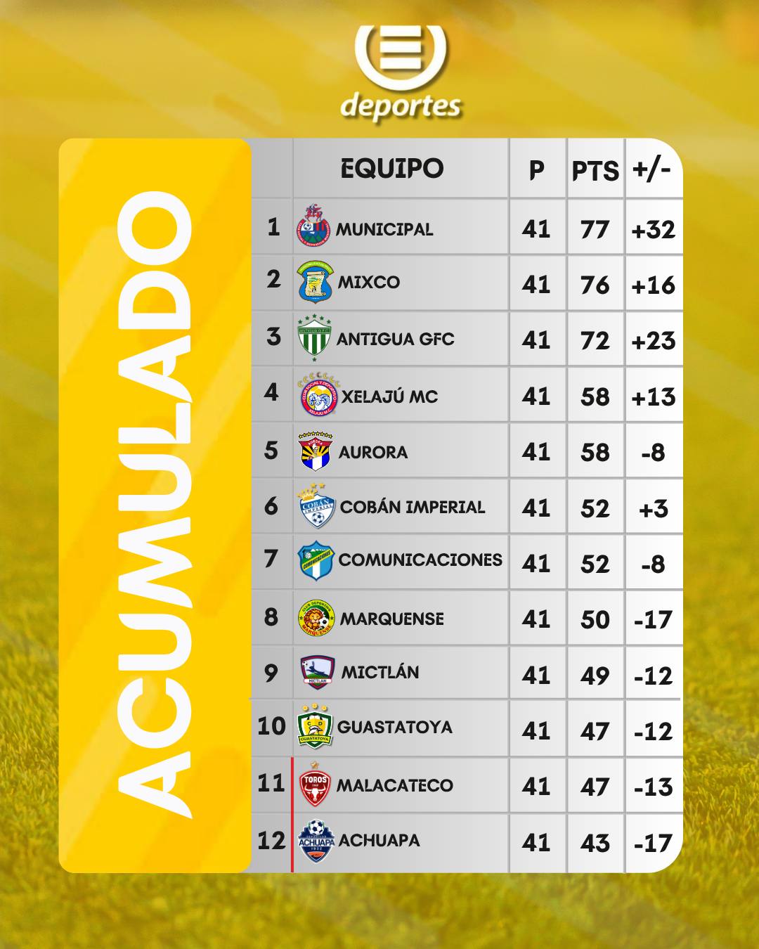 El último lugar es Achuapa con 43 puntos y está a cuatro puntos de distancia de Malacateco y Guastatoya (ambos con 47) rivales que tiene que superar para lograr la permanencia. Es de recordar que en disputa habrá 9 puntos y de esos, Achuapa debe ganar por lo menos 5 y esperar derrotas de sus rivales para salvar la categoría.