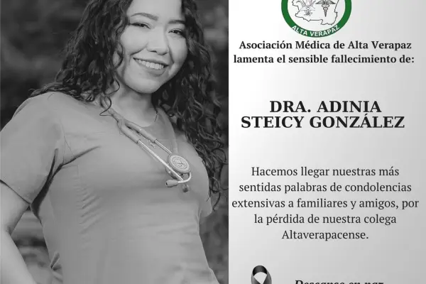 La Asociación Médica de Alta Verapaz publicó una esquela en sus canales oficiales, lamentando el deceso de Adinia González. En el mensaje, la entidad hizo llegar sus más sentidas condolencias a familiares y amigos.