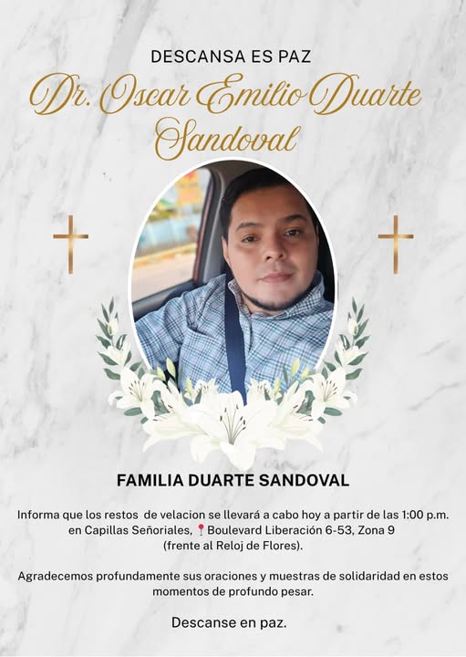De la misma forma, una asociación de vecinos de Villa Nueva expresó dolor la muerte de Óscar Duarte. En el mensaje, informaron que el cuerpo del galeno está siendo velado en una funeraria de la zona 9 capitalina, frente al Reloj de Flores.